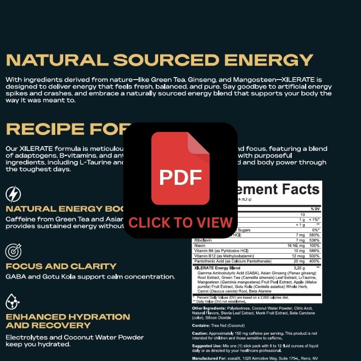 XILERATE™ - For those who seek sustained energy without artificial ingredients, our formula answers with a blend that is rich in antioxidants, adaptogens, and essential nutrients. Every ingredient was chosen to nourish and energize, making XILERATE™ an ideal option for people who prioritize health and wellness but still want that much-needed boost to fuel their active lives.